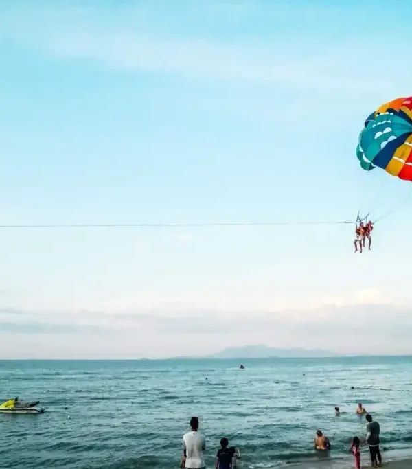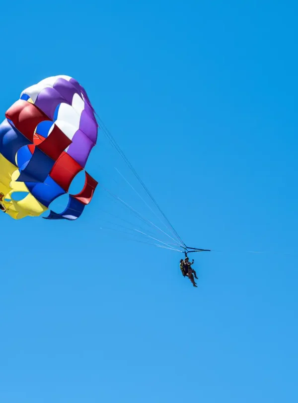 The adventure begins as you gear up with all necessary equipment. Skilled staff will guide you through every step, ensuring you feel confident before takeoff. Once airborne, you will glide over the water, feeling the rush of the wind and enjoying a panoramic view of the coastline. Because the parachute is designed to hold up to two people, you can share this moment with a friend or loved one.